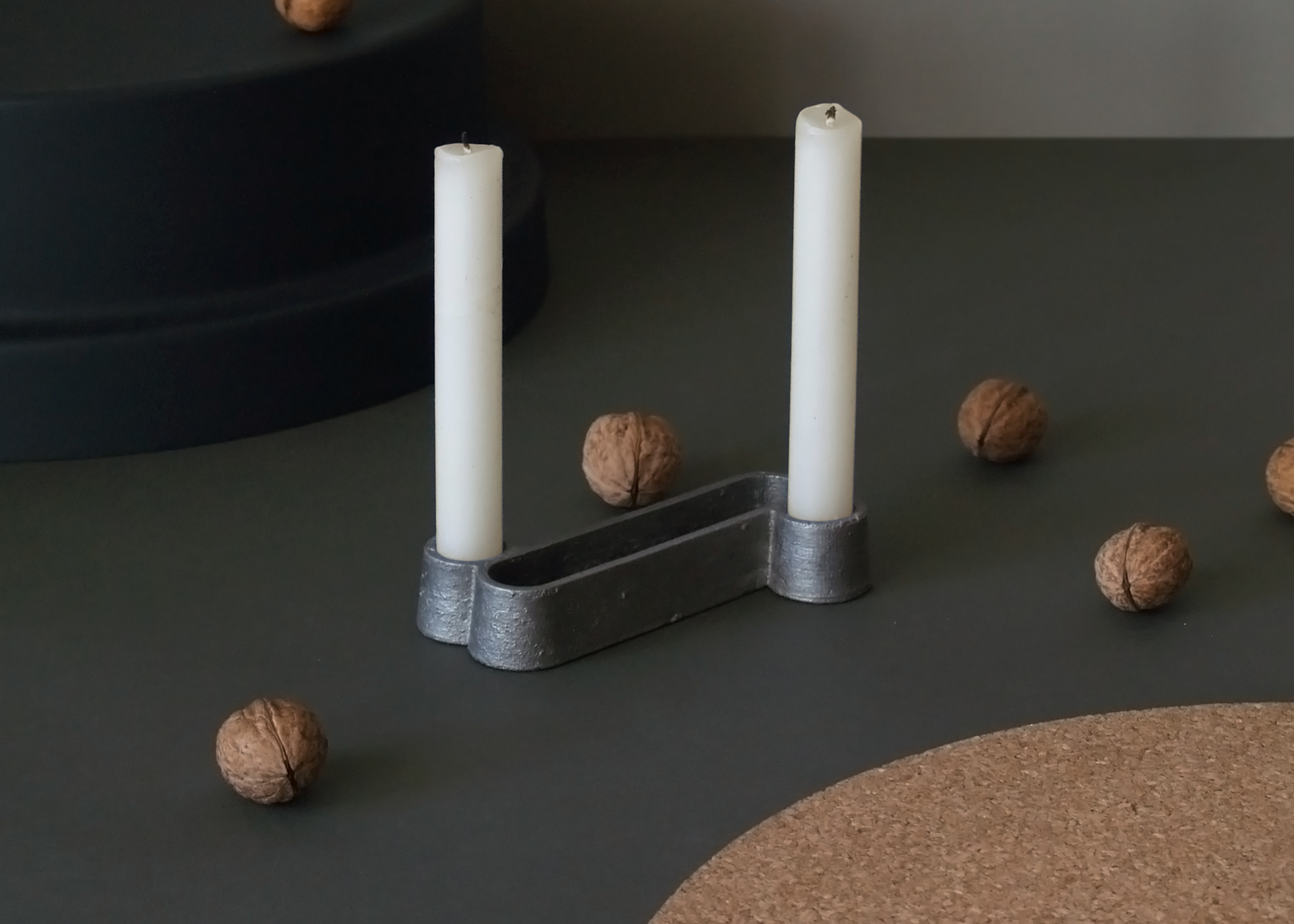Świecznik odlewany ze stali. Dzięki zdjęciu formy bezpośrednio z wydruku 3D powierzchnia jest chropowata i surowa.